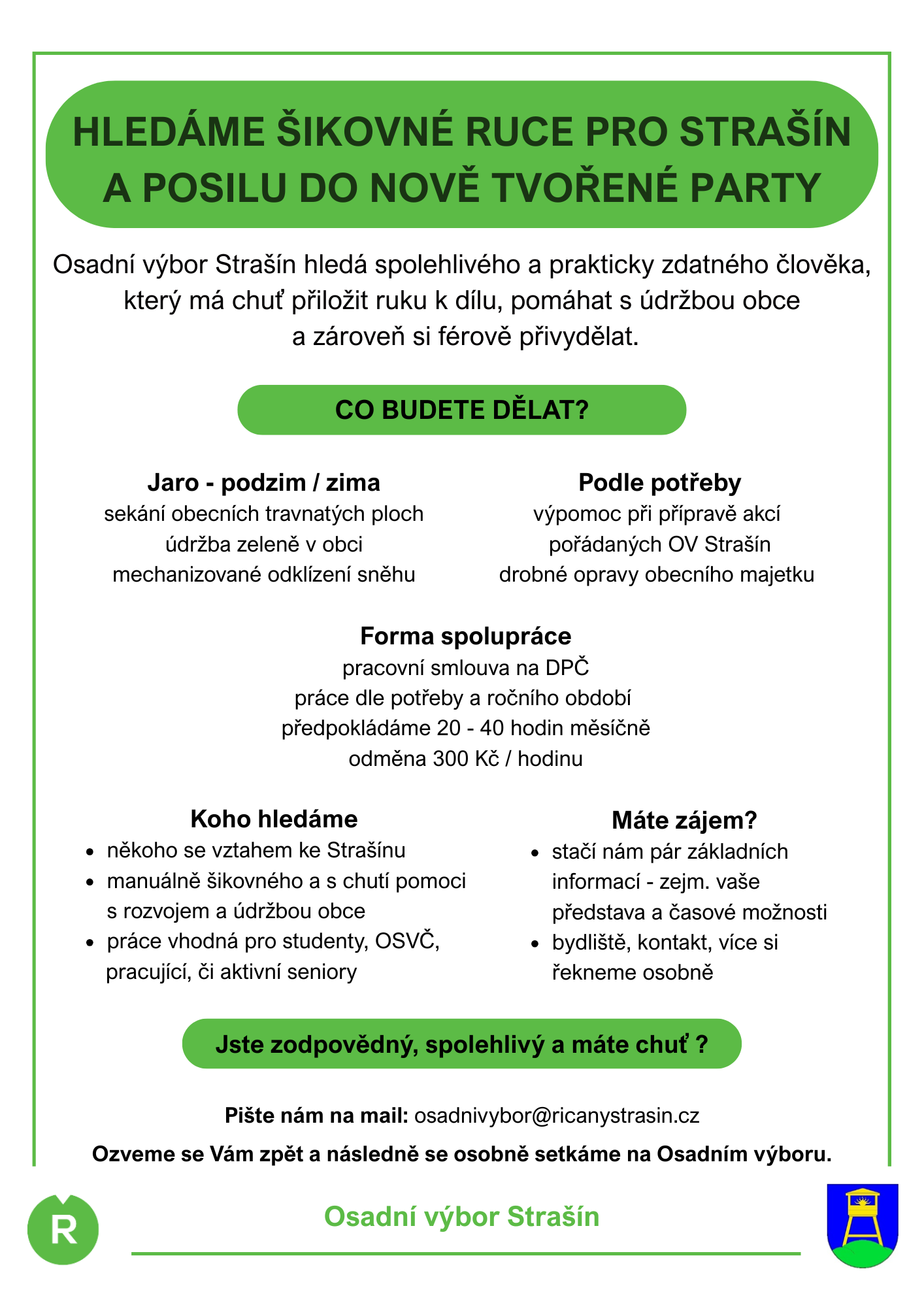 Osadní výbor Strašín rozšiřuje pracovní tým a hledá šikovné, spolehlivé a prakticky zdatné lidi, kteří mají chuť přiložit ruku k dílu a pomáhat s údržbou obce.