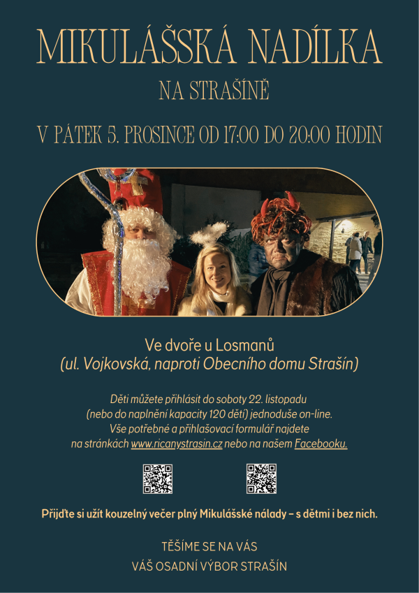 Milí strašínští rodiče, čas Mikulášské nadílky se blíží!Letos se uskuteční v pátek 5. prosince od 17:00 do 20:00 hodin,ve dvoře u Losmanů (ul. Vojkovská, naproti Obecnímu … číst více
